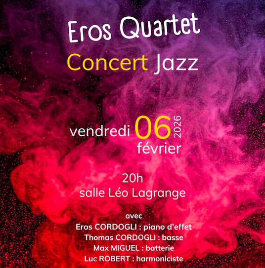 Avec Eros Cordogli (piano d’effet), Thomas Cordogli (basse), Max Miguel (batterie), Luc Robert (harmoniciste). En 1ère partie : lauréats piano et violoncelle.